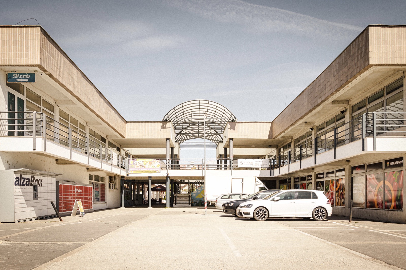 A szocreál kocka vagy modernista stílusban épült vasbeton szerkezetű szolgáltatóházat a nyolcvanas évek közepén adták át. Zdroj élelmiszerüzletnek, cukrászdának, valamint a 03-as számú postának és egyéb szolgáltatásoknak adott otthont. Itt 1986-ban a Kommunális Vállalat órajavító műhelyt is nyitott. Mindeközben a Sport utca túloldalán a Jednota már 1983-ban átadta élelmiszerüzletét. A Zdroj az új üzemegységeinek feltöltésére rendszeresen toborozta alkalmazottait. 1986-ban a két dunaszerdahelyi lakótelepi egysége mellett Bősön is nagyobb üzletközpontjuk nyílt: