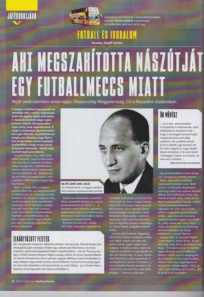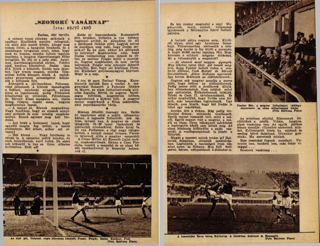 Befutott író volt már, amikor 1937-ben, nászútját megszakítva Torinóból tudósította a Színházi Élet című lapot az olasz–magyar futballmeccsről; a Giuseppe Meazzával felálló olaszok 2:0-ra nyertek (Sárosi bordarepedést szenvedett az első félidőben), Rejtő pedig a Szomorú vasárnap címet adta beszámolójának, az egyetlen magyar világslágerre, Seress Rezső „öngyilkos dalára” utalva.